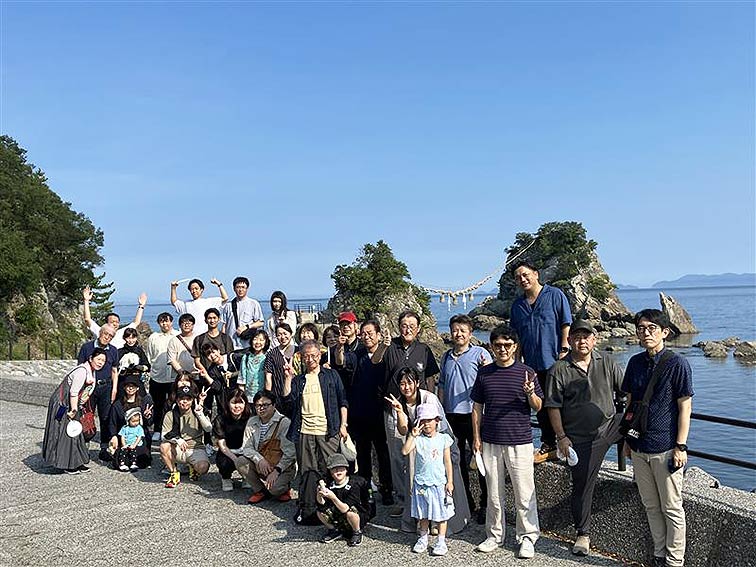 午後は、西日本で唯一見学可能な甘酒工場を訪れ試飲した後、「海の市場〇(まる)」では、地元特産の魚介類、干物、特産品などを買いあさり、その後「豊後二見ヶ浦」を訪れ、青く澄んだ空と海に浮かぶ夫婦岩を背景に記念撮影。自然の美しさと爽やかな潮風に心が洗われました。